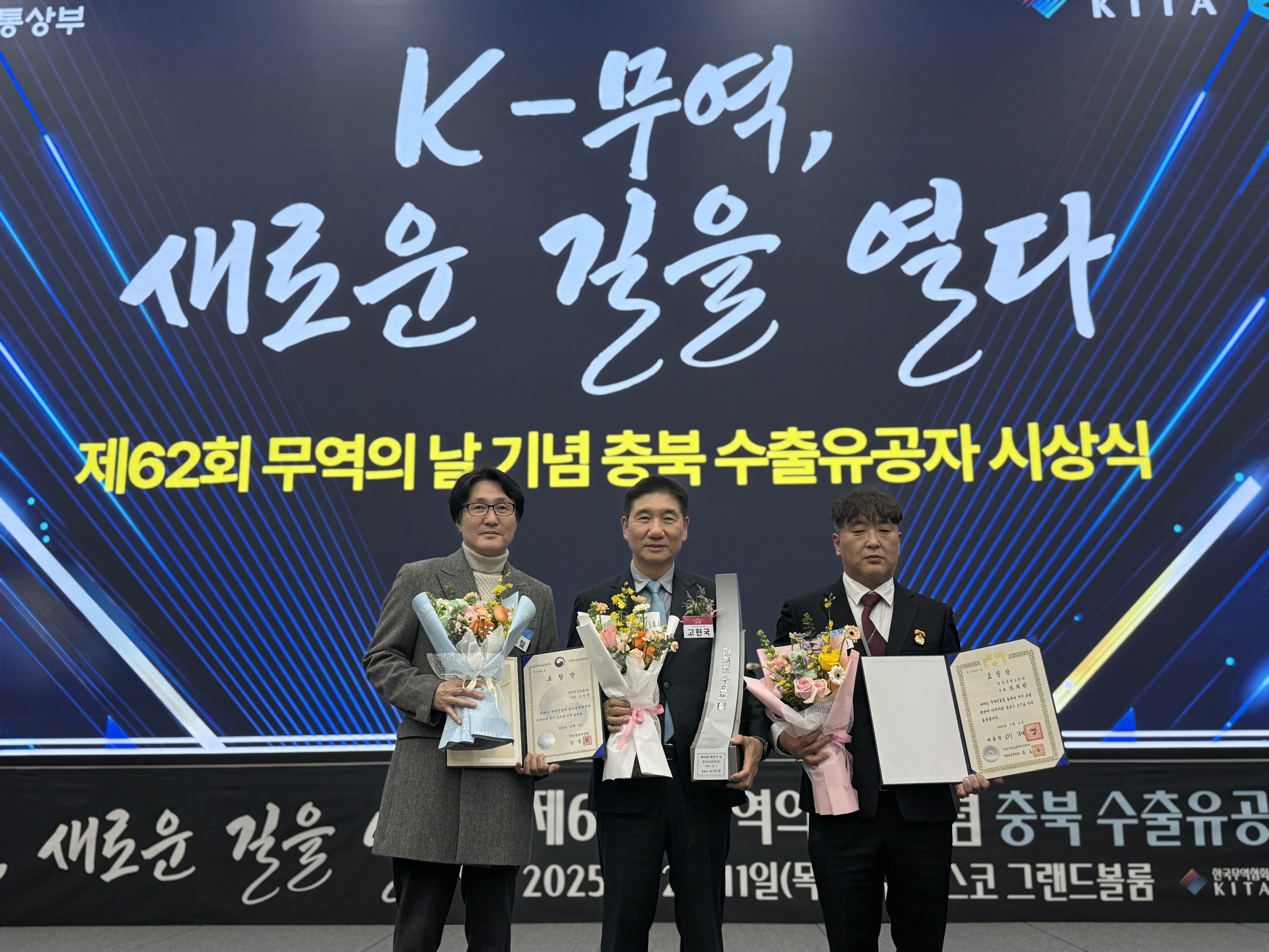 전진건설로봇은 12 11일 열린 제 62회 무역의 날 기념 충북 수출유공자 시상식에서 ‘1억불 수출의 탑을 수상했다.