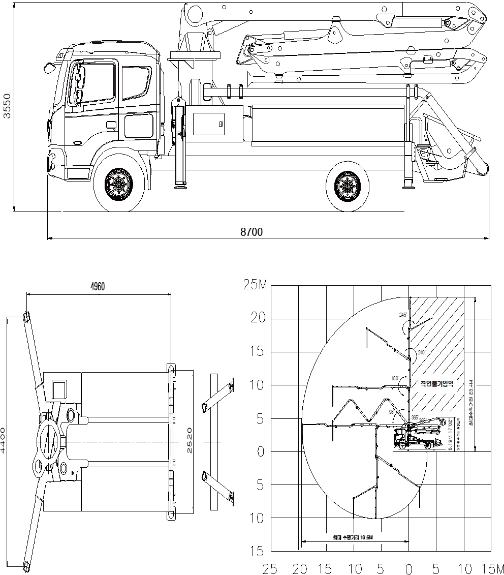 건설기계 콘크리트 펌프카 29 ~ 20M JX-Z26 JX-Z26 타입 Z TYPE 4단붐 트럭 현대 신형 파비스 325마력(4X2) 스펙 다운로드 SPECIFICATION 출력 325PS/2,300rpm 콘크리트 전면 압력 (로드쪽) 54 Bar 기통수 6 콘크리트 전면 압력 (피스톤쪽) 80 Bar 최대지상고 23.5M 콘크리트 실린더 내경 * 스트로크 230 X 1,400mm 수송관 경 107mm 유압 시스템 최고설정 압력 350 Bar 엔드호스 길이 3M 윤활시스템 자동유압식 무선리모콘 STANDARD 스트로크 절환장치 유압절환식 물탱크용량 500L 호퍼용량 450L 물펌프 20 Bar 분당 최대 작동횟수 - 토출양(로드쪽) 109m3/h 전방 아웃트리거 X-TYPE 확장식 토출량(헤드쪽) 73m3/h 후방 아웃트리거 수평,수직 확장식 DIMENSIONS & DIAGRAM