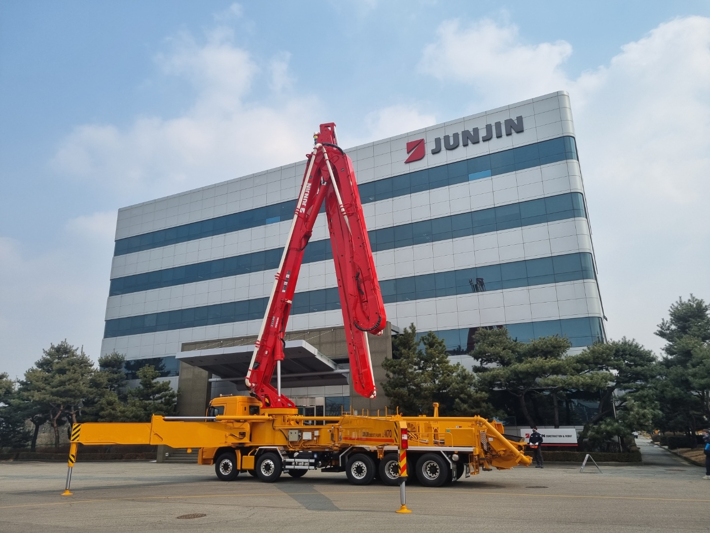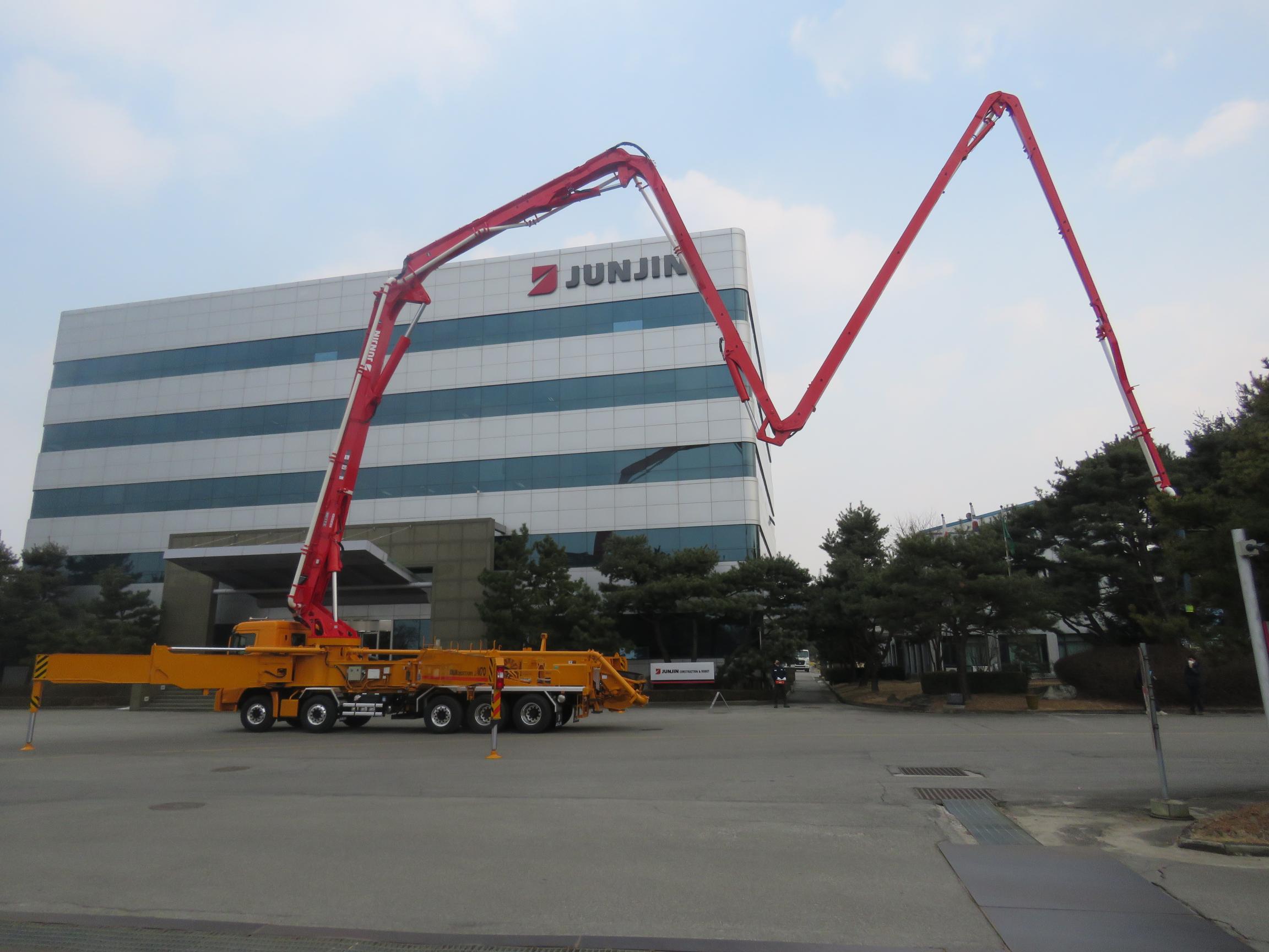 건설기계 콘크리트 펌프카 70 ~ 50M JJ-M70 JJ-M70 타입 6단붐 R&Z TYPE 스펙 다운로드 SPECIFICATION 출력 520PS/1800rpm 콘크리트 전면 압력 (로드쪽) 87 Bar 기통수 6 콘크리트 전면 압력 (피스톤쪽) 130 Bar 최대지상고 61.1M 콘크리트 실린더 내경 * 스트로크 230 X 2,100mm 수송관 경 125mm 유압 시스템 최고설정 압력 350 Bar 엔드호스 길이 4M 윤활시스템 자동유압식 무선리모콘 STANDARD 스트로크 절환장치 유압절환식 물탱크용량 500L 호퍼용량 600L 물펌프 20 Bar 토출양(로드쪽) 172m3/h 전방 아웃트리거 스윙, 수평&수직확장식 토출량(헤드쪽) 115m3/h 후방 아웃트리거 스윙, 수직확장식 DIMENSIONS & DIAGRAM